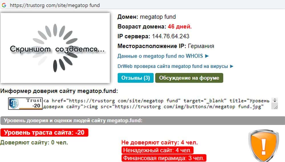 Домен жуликов Мега Топ Фонд существует всего-то 46 дней, так что тут они даже почти не соврали. Сам сайт ненадежен, например, портал trustorg com советует обходить его стороной. Так что вкладываться в псевдофонд, которому чуть больше месяца, как минимум странно. По сайту даже не понятно, чем, собственно, фонд занимается и на какой платформе.