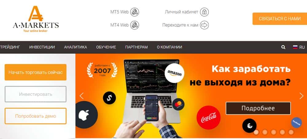 Кстати, видео те же, что и в "обучении" на сайте Мега Топ Фонд, так что с разнообразием и креативностью у катал туго. Интересно, где же жулье из MegaTop Fund торгует? И куда советует идти торговать тем, кого не удалось развести на доверительное управление? Оказывается, к печально известному брокеру-лохотронщику AMarkets, который сливает счета.
