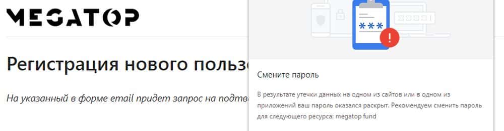 Вряд ли наперсточники Мега Топ Фонд слышали о политике конфиденциальности. На их сайте нет соответствующих документов или даже упоминаний. Хотя и защищать жуликам нечего - они просят только адрес почты, чтобы присылать реквизиты для оплаты. А при попытке работать с сайтом выскакивает пугающее сообщение, что ваш пароль уже перехватили.