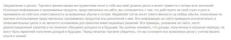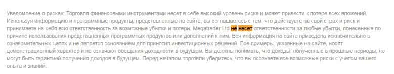Лохотронщики МегаТрейдер особо не заморачивались и не создавали клиентское соглашение, только уведомления о рисках. Они не несут ответственность за ваши убытки!