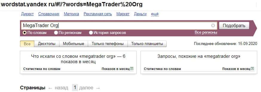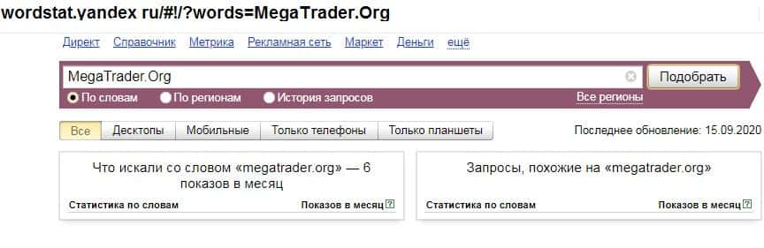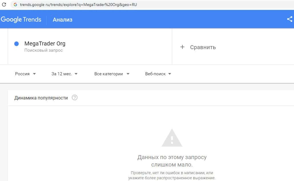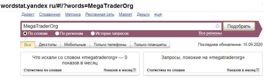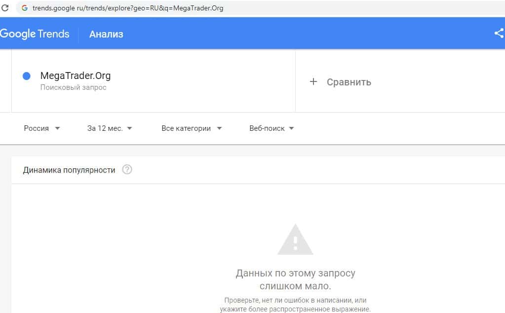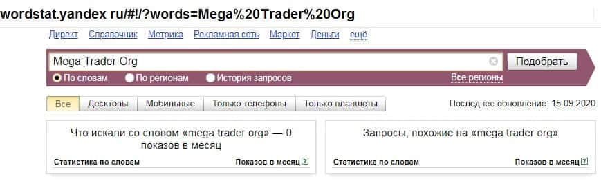 Третий запрос на английском языке без пробелов "MegaTraderOrg", выдает результат 0 показов. Так жуликов тоже никто не искал.