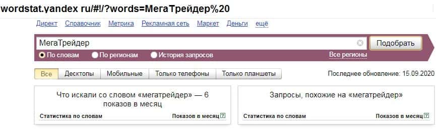 Переходим на запросы в Яндексе на русском языке. Первый запрос будет без пробелов "МегаТрейдер ", результат выдал 6 показов в месяц.