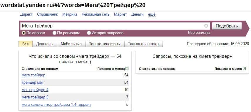 Последний запрос на русском языке с одним пробелом "Мега Трейдер", результат выдает 54 показа в месяц.