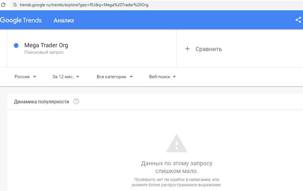 Второй запрос на английском языке с двумя пробелами "Mega Trader Org", выдает результат 0 показов. Так жуликов никто не искал.