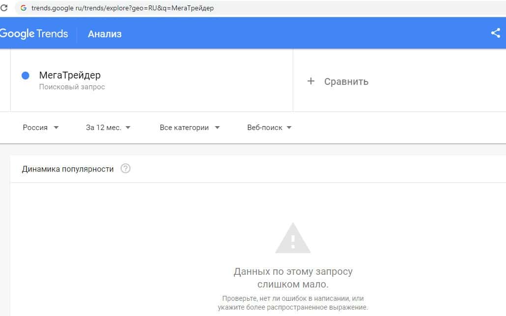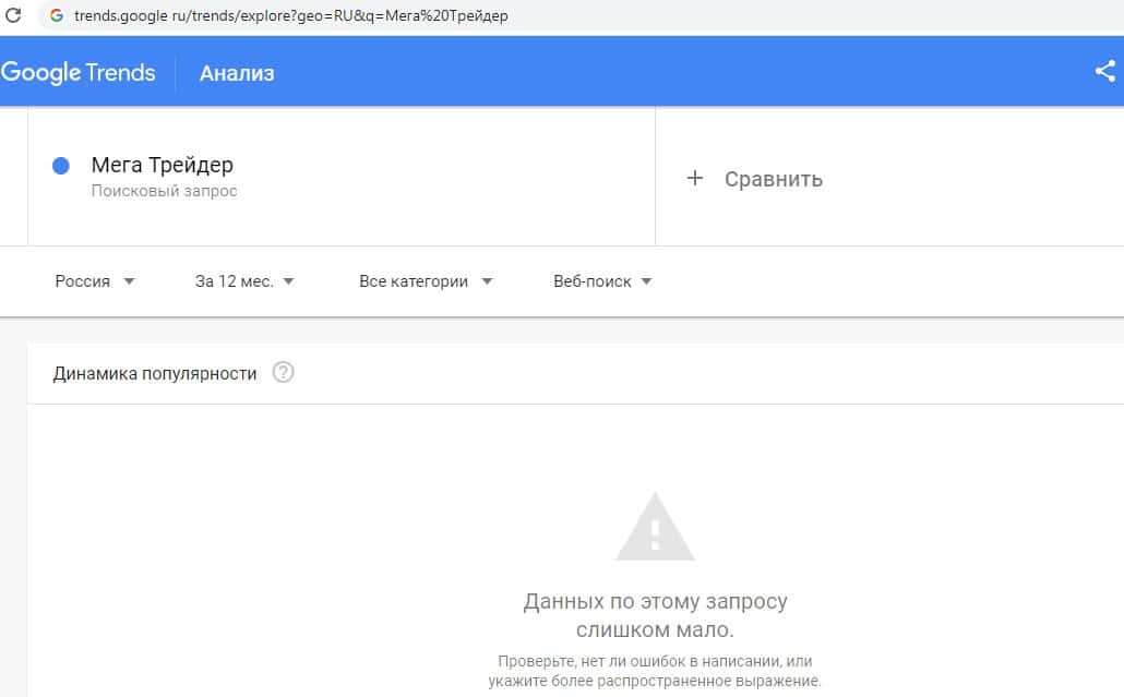 Следующие запросы в Google будут на русском языке. Первый запрос без пробелов "МегаТрейдер ", результат выдает 0 показов в месяц.