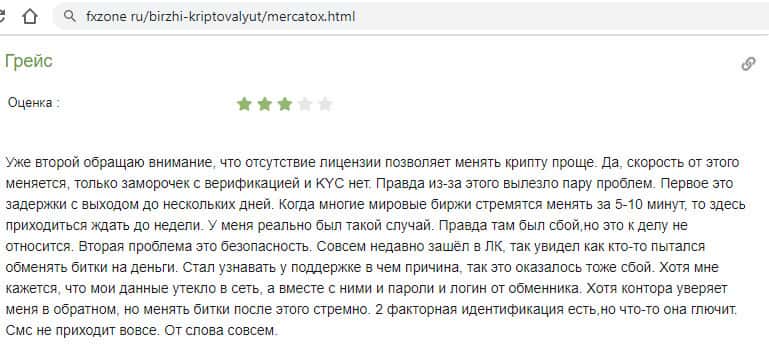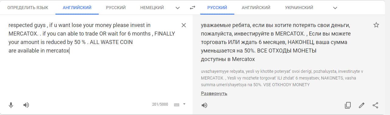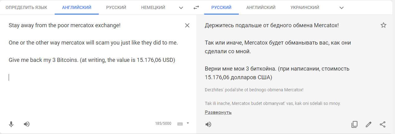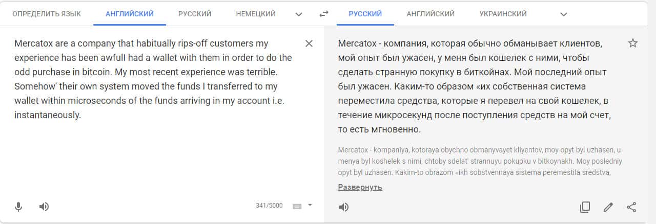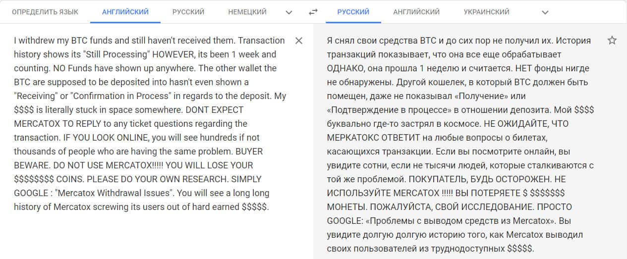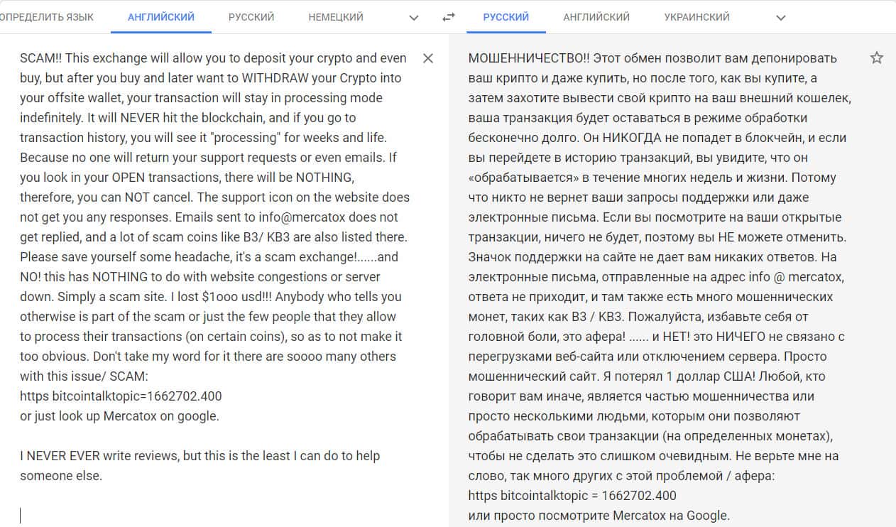Переведенный отзыв о работе конторы Mercatox на сайте translate.google com.
