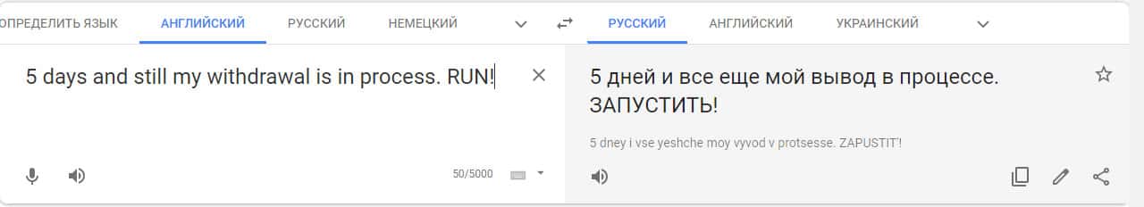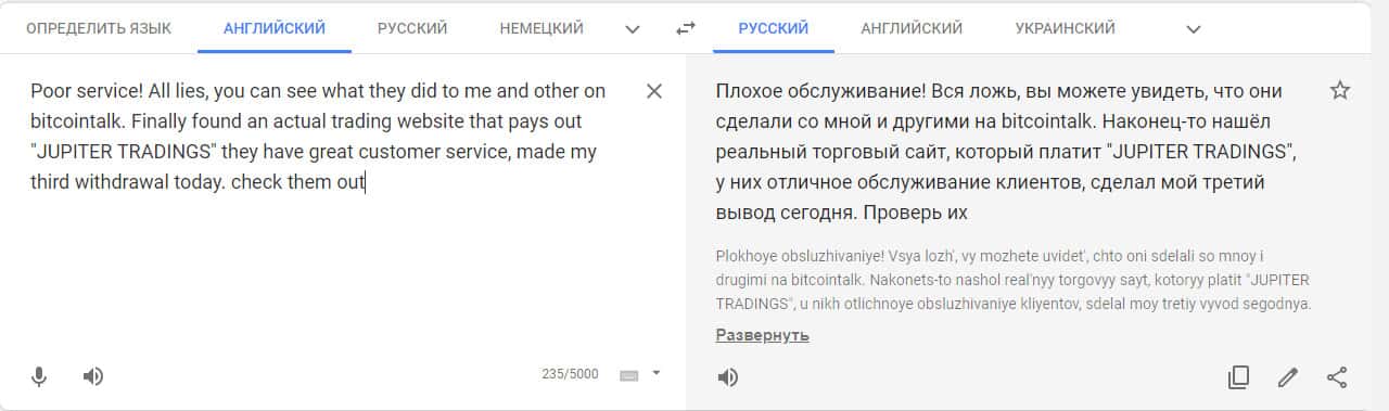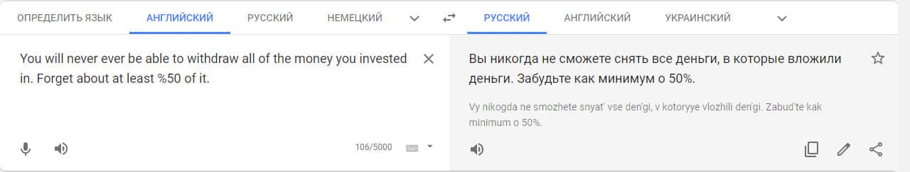 Переведенный отзыв о работе лохотрона на translate.google com.