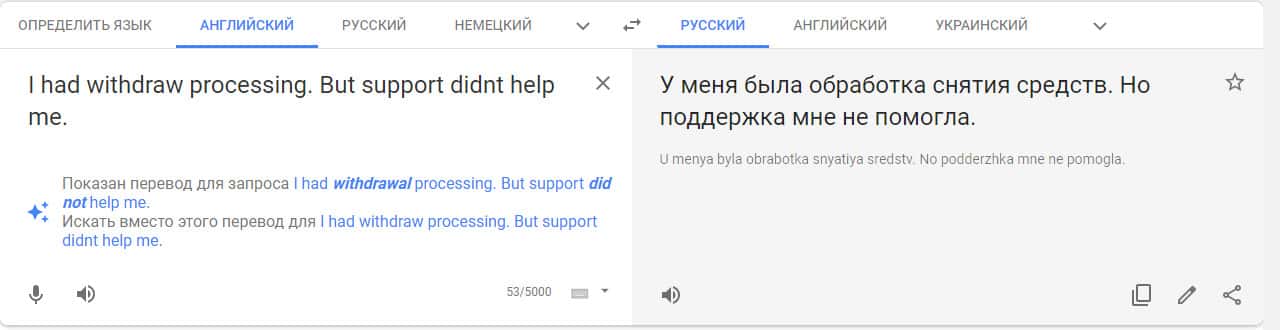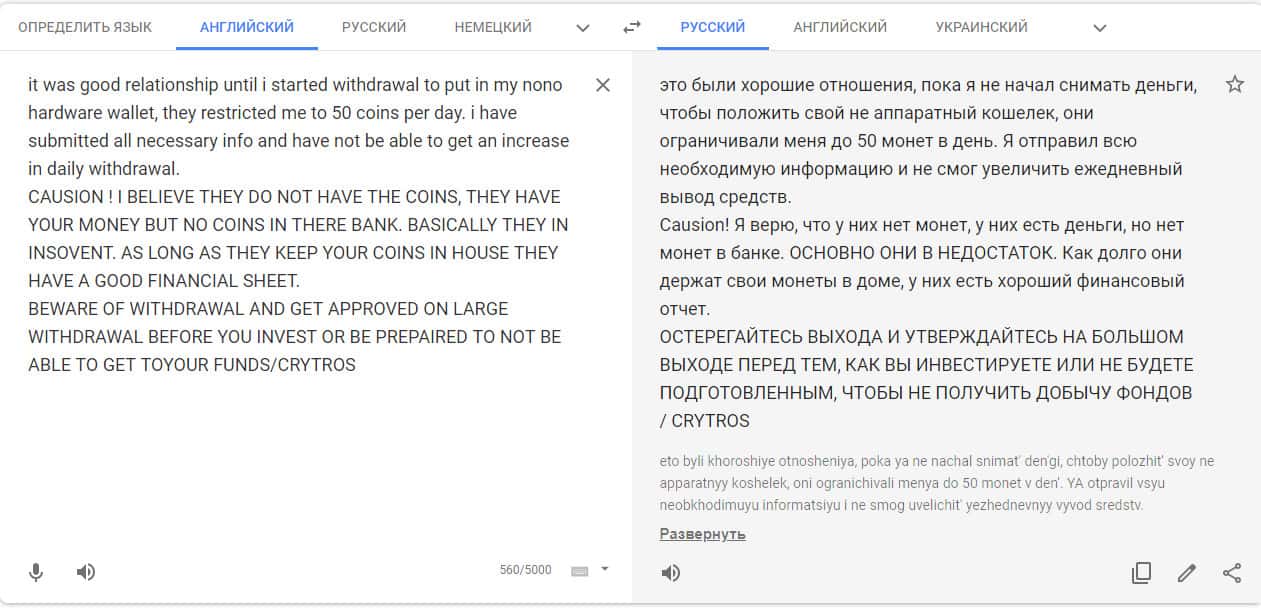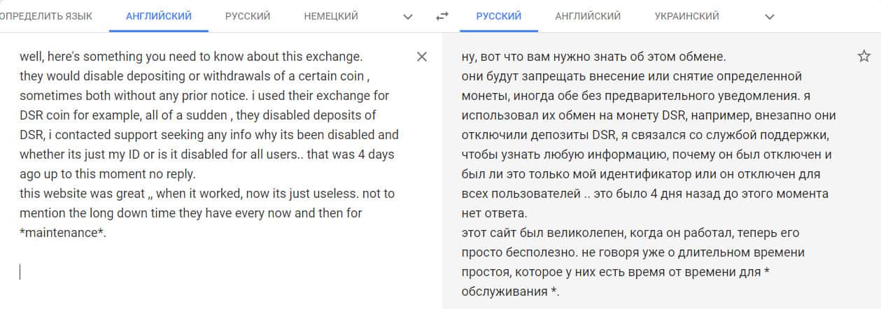 Переведенный отзыв о работе криптобиржи на сайте translate.google com.