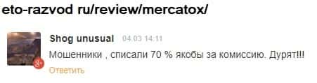 Как только клиент сталкивается с реальной работой с жуликами Мер Катокс, то он сразу же попадается на кидок. Хорошо, что люди начали все больше и больше писать реальных отзывов о работе этого лохотрона. Есть надежда, что кинутых будет становиться меньше и меньше. Но на некоторых и это не действует.