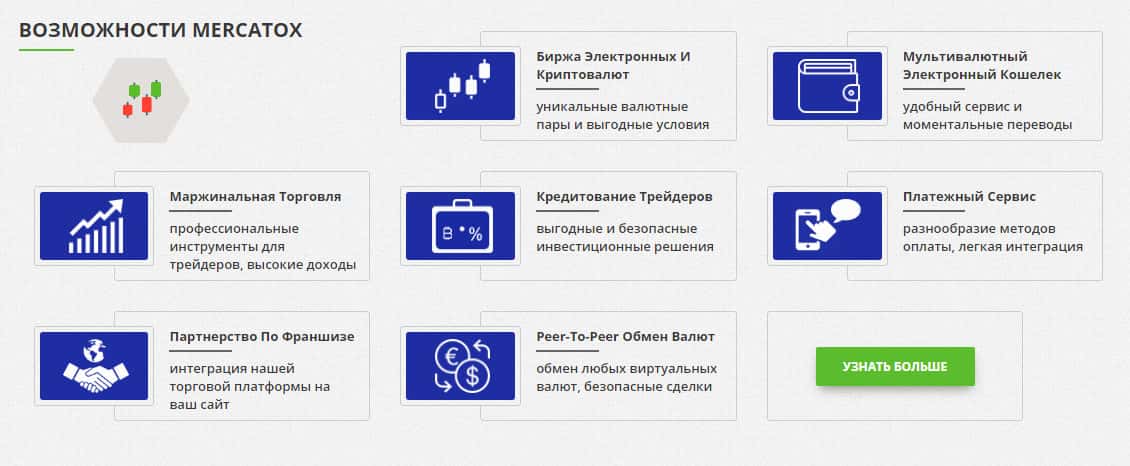 У себя на сайте жулики mercatox com предлагают несколько видов "возможностей" (как они сами говорят): маржинальная торговля, биржа электронных и криптовалют, партнерство по франшизе, кредитование трейдеров, Peer-To-Peer обмен валют, мультивалютный электронный кошелек, платежный сервис. И в каждой такой возможности вас кинут на деньги.
