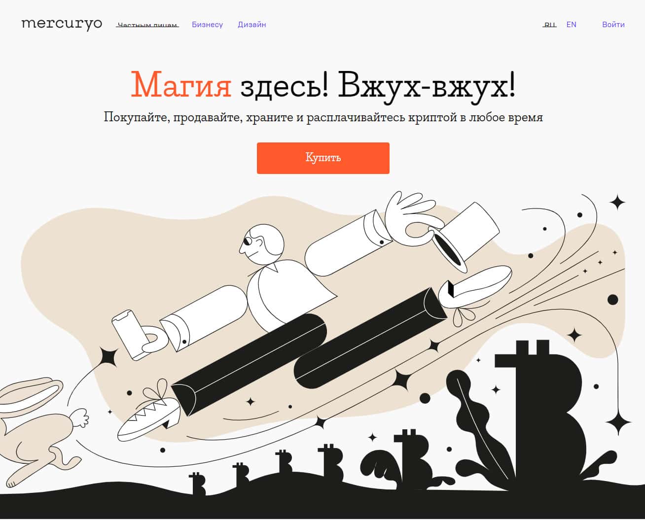 Начинается веб-портал у ворюг из конторы Mercuryo весьма оригинально: с незаурядного слогана и интересного дизайна. Один привлекающий внимание слоган чего стоит: "Магия здесь! Вжух-вжух!" Мда, креативненько, вложили денежки, чтобы красочной картинкой привлечь к себе еще больше клиентов, а затем облапошить их на крупную сумму денег.
