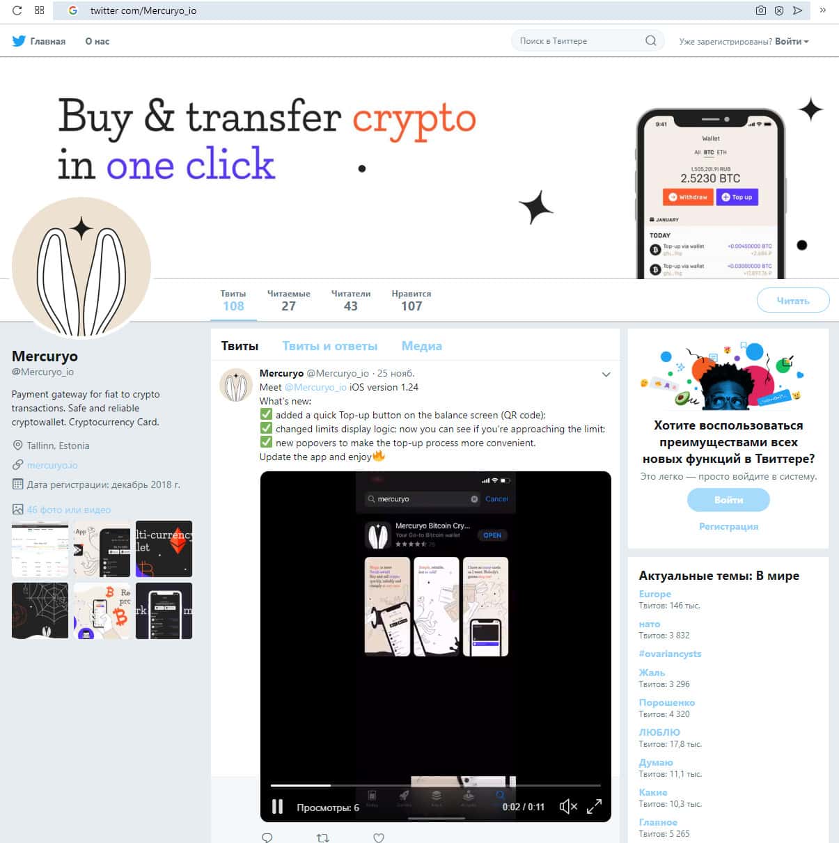 - Твиттер twitter com/Mercuryo_io