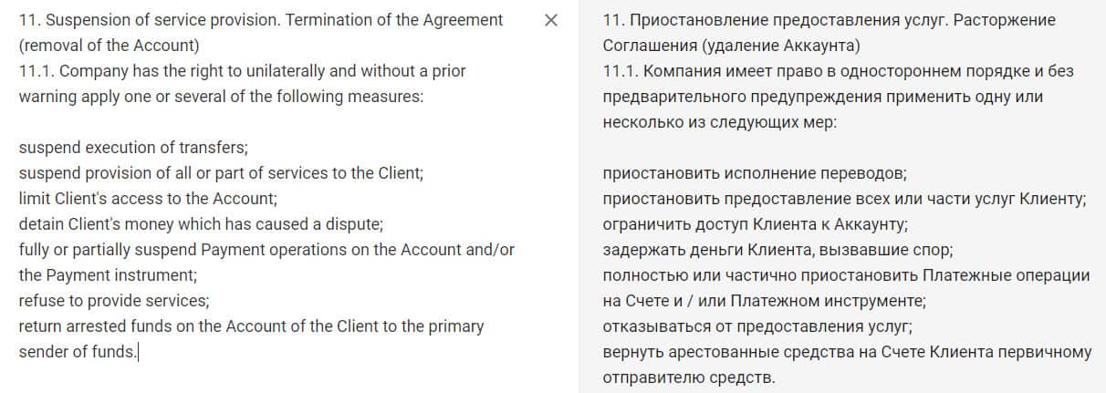 Следующим, еще более ошеломляющим пунктом договора с ворюгами из брокерской конторы Меркурио, является пункт 11.1., в котором говорится, что брокер вправе без предварительного предупреждения и в одностороннем порядке приостановить исполнение переводов и т. д. Явное нарушение прав пользователей вне всех рамок закона.