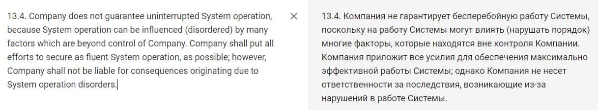 Завершающим аккордом во всей этой афере проходимцев из псевдоброкерской организации Mercuryo стал пункт 13.4., в котором идет речь о том, что компания даже не гарантирует работу Системы, так как это зависит от всякого рода форс-мажоров. Тогда у нас только один вопрос, а за что несет ответственность сам брокер.