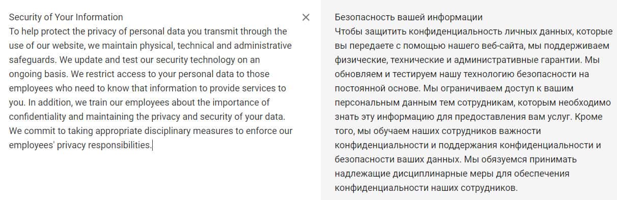 И последний раздел политики конфиденциальности посвящен безопасности информации клиентов. Это единственный раздел, где упоминается, что брокер вообще обязуется хоть что-то выполнять во благо своих клиентов. Увы, даже этот теоретический раздел не совпадает с реалиями работы с этой компанией. Так как имеет лишь негативные отзывы людей.