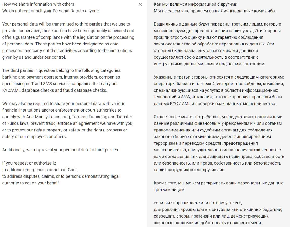 Следующий раздел политики конфиденциальности посвящен передаче личной информации трейдеров мошенниками из Меркурио третьим лицам. Со слов жуликоватого брокера эти компании прошли тщательную проверку, а на самом деле еще одни махинаторы, которые помогают сотрудникам псевдоброкера обворовывать честных пользователей.