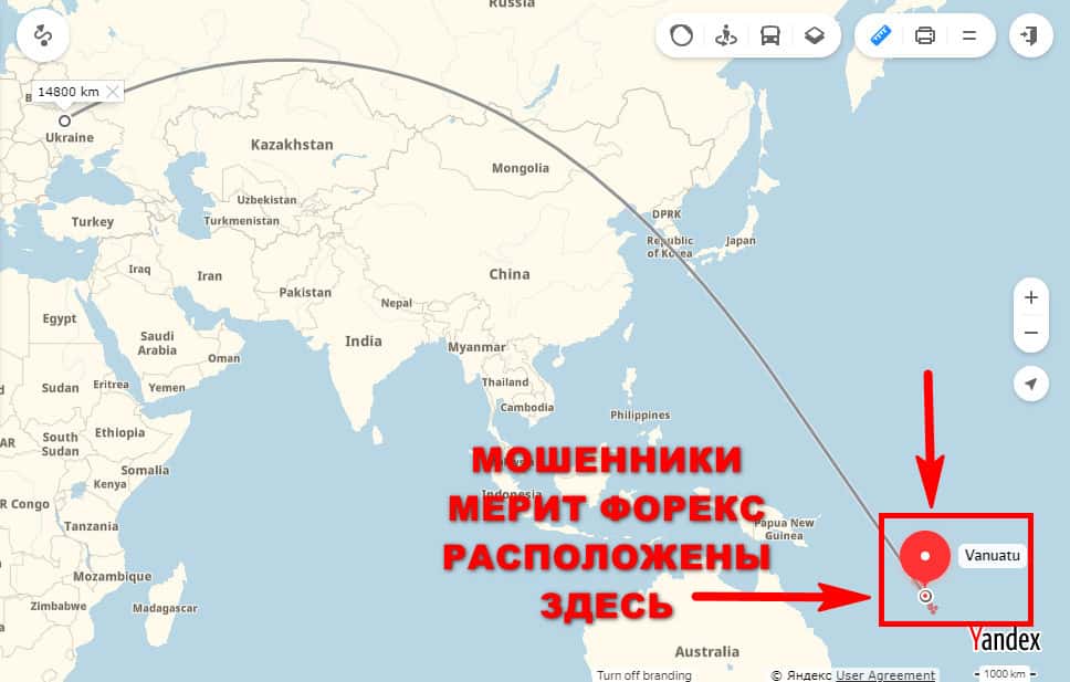 Для того, чтобы не нести ответственность перед опрокинутыми клиентами и была возможность вывести украденные деньги без уплаты налогов, аферисты MeritForex решили разместить свой офис на оффшорных островах Вануату, где их точно никто не найдет. Адрес мошенников: PO Box 1276 Port Villa Vanuatu Republic of Vanuatu.