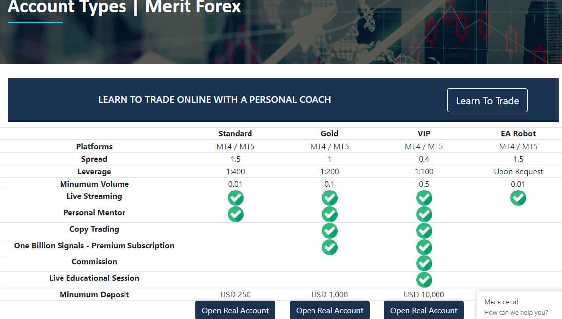 Шарлатаны MeritForex имеют низкий рейтинг в условиях торговли, так как толком ничего хорошего предложить не могут. Плече 1 к 400 уничтожит любого не то чтобы дейтрейдера, а даже скальпера. Мошенники предлагают стандарты депозита от 250 долларов и выше, что довольно много для начинающего трейдера.