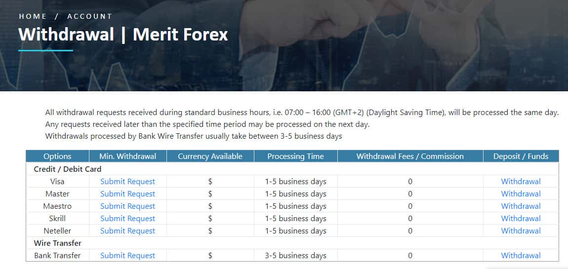 В шарлатанской организации MeritForex также обозначили таблицей с разными условиями вывод средств, только не предупредили, что аферисты не выплачивают вообще. Жулье использует все это, чтобы запарить мозги клиентам. Так что не стоит рисковать и вкладывать туда свои кровно заработанные.