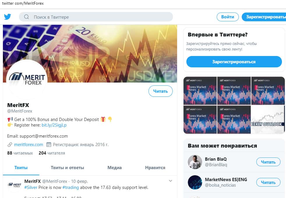 Также стоит отметить, что жулье MeritForex работает в соц-сети Твиттер, где также создало себе аккаунт и ведет мини-блог. Аферисты привлекли внимание около 200 подписчиков и это с учетом того, что аккаунт зарегистрирован в январе 2016 года. Таким образом советуем ознакомиться с ссылкой twitter com/MeritForex