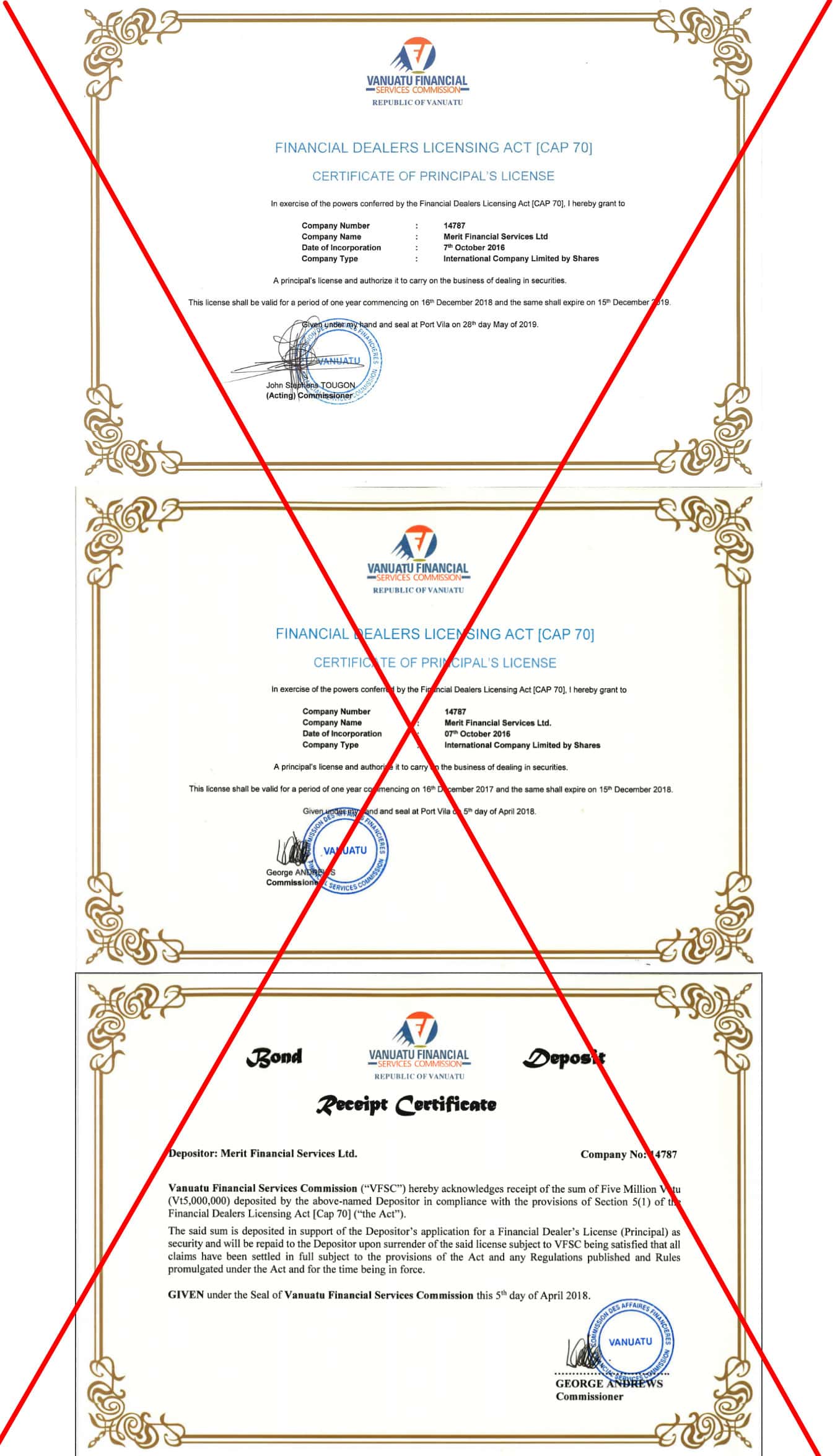Что касается регуляции деятельности конторы MeritForex, то с 2018 года, аферисты решили таки приобрести лицензию от регулятора острова Вануату, а именно Vanuatu Financial Services Commission. Это можно считать лицензией, но все же она вас не спасет, когда все ваши деньги пропадут с открытого счета в этой брокерской организации.