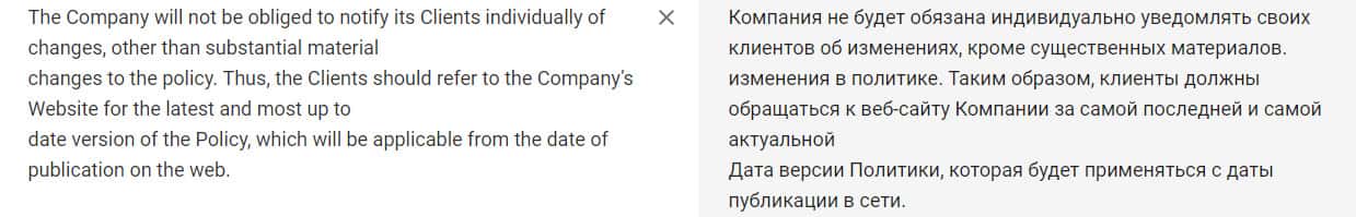 Согласно еще одного раздела политики конфиденциальности кухни MeritForex, мошенники снимают с себя обязанность заранее предупреждать своих клиентов об изменениях в этом документе. То есть это может произойти внезапно и, все данные о себе, которые вы передали, могут оказать в ненужном месте.