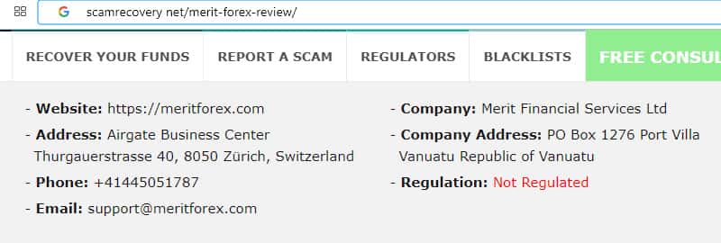 Если рассматривать всю деятельность конторы MeritForex в комплексе, то не стоит забывать, что аферисты не смогли предоставить документы о регуляции своей работы. Оффшорный брокер из Вануату считает, что это ненужная затея, и за это получает соответствующую оценку.