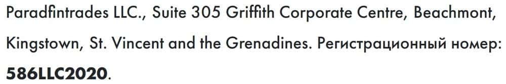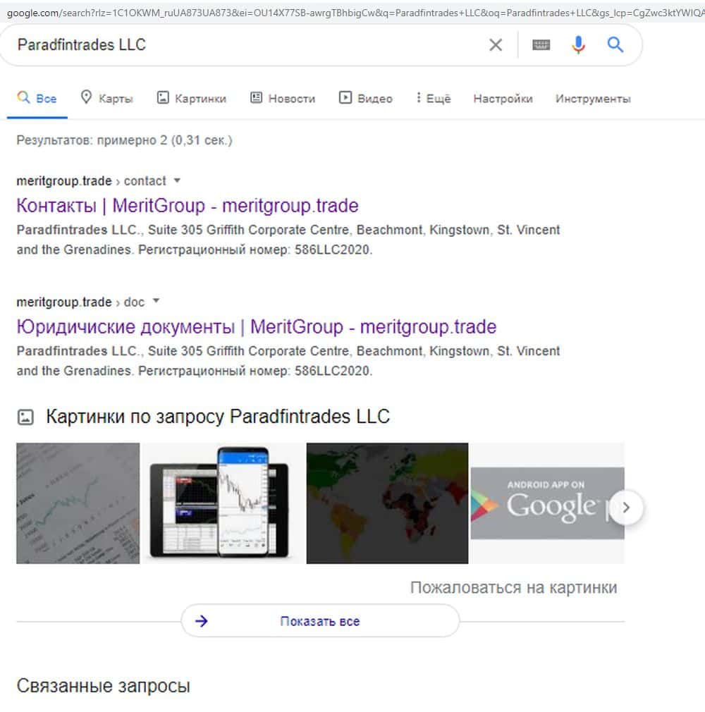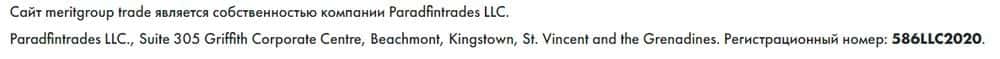 В футере своего сайта кидалы Мерит Групп утверждают, что действуют под руководством сомнительной конторы Paradfintrades LLC которая якобы имеет официальную регистрацию.