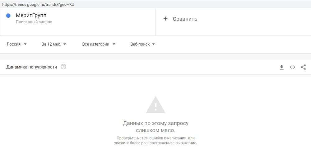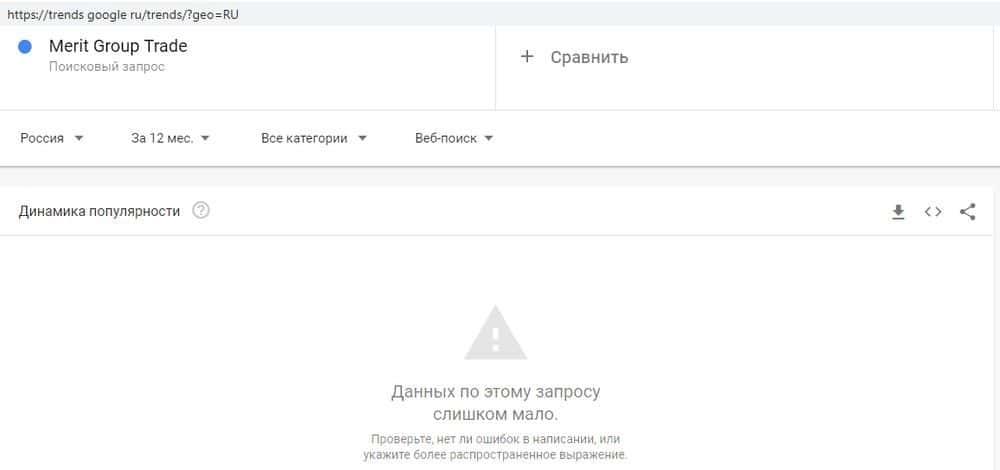 Среди пользователей Гугл лохотрон "Мерит Групп" еще менее популярен. Так, по запросу "Мерит Групп" к поисковику вообще никто не обращался, и это показывает, чего стоит афера.