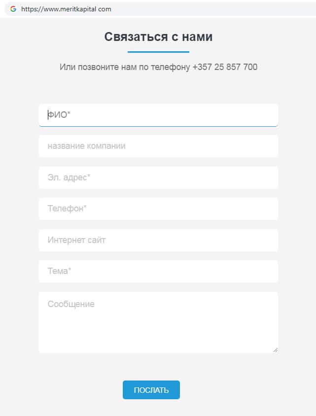 Жулики Мерит Капитал предлагают пользователям заполнить бланк обратной связи, где просят указать свое имя, фамилию, отчество, адрес электронной почты и номер телефона.