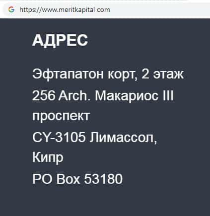 Мошенники MeritKapital указали адрес местонахождения главного офиса своей компании, который вероятнее всего липовый: