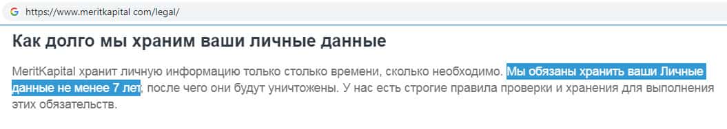 Шулера Мерит Капитал пишут о том, что хранят данные о клиенте 7 лет и в этот период могут их передавать сомнительным конторам и третьим лицам.