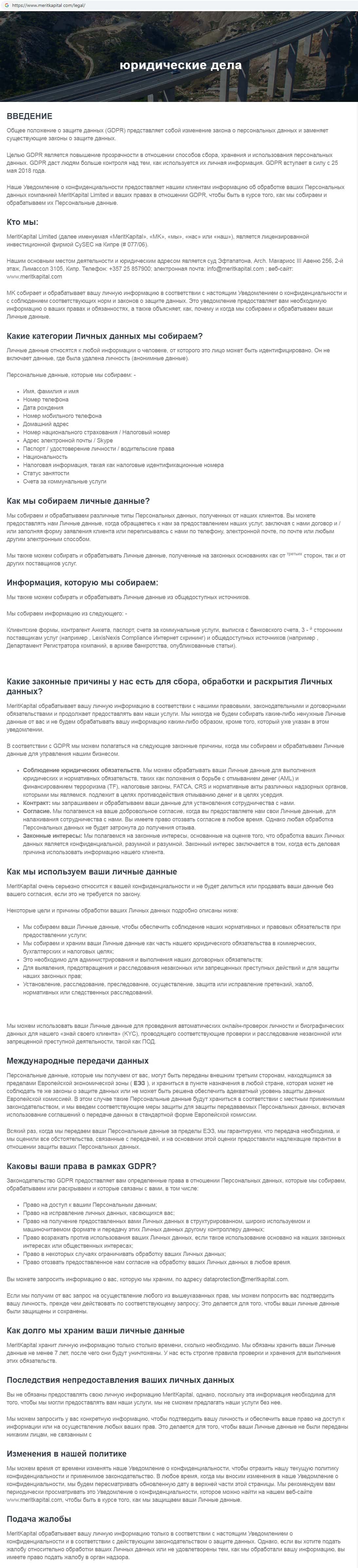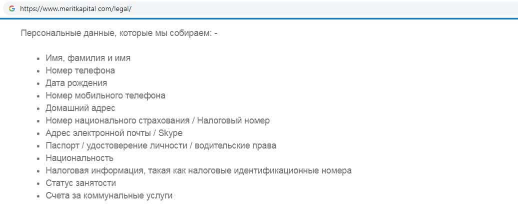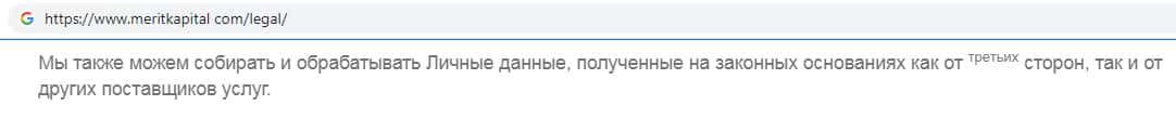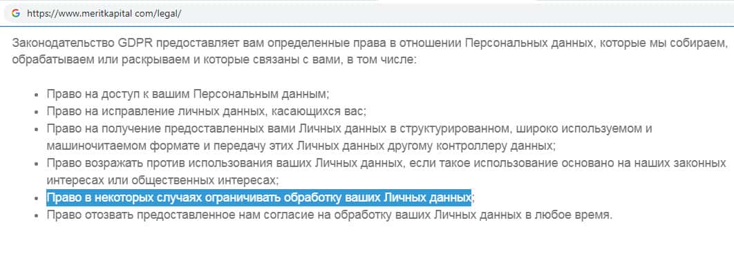 Аферисты MeritKapital в случае подачи заявки на вывод средств могут не обрабатывать Ваши данные, ссылаясь на этот пункт в клиентском соглашении.