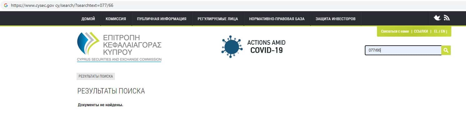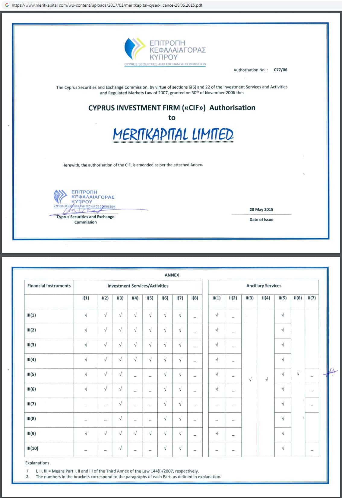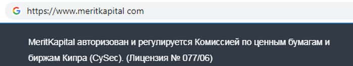 На сайте финансового регулятора комиссии по ценным бумагам и биржам Кипра нет результатов о регистрационном номере и лицензии брокерской конторы MeritKapital.