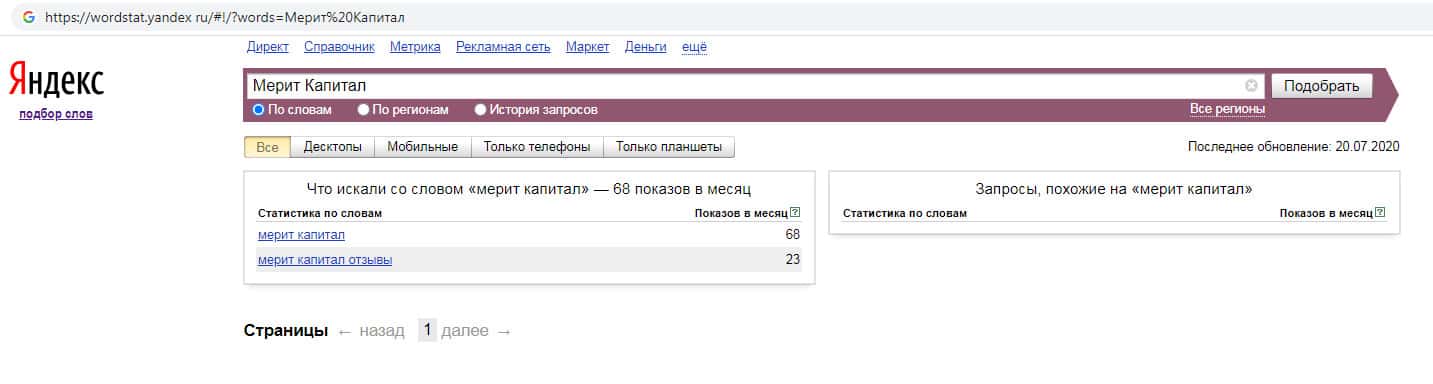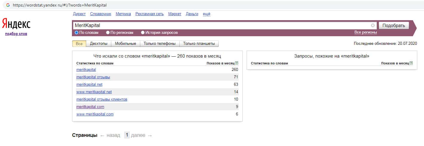 Данный интернет-лохотрон под названием "MeritKapital" скорее всего пользуется популярностью на wordstat yandex ru из-за рекламы в интернете.