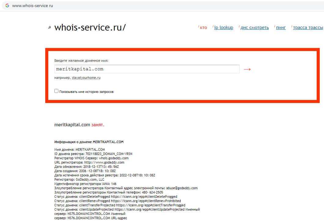 Сервис whois-service ru не может найти данные о владельце домена сайта мошеннической организации MeritKapital, доверять сайту данной скам-конторы нельзя.