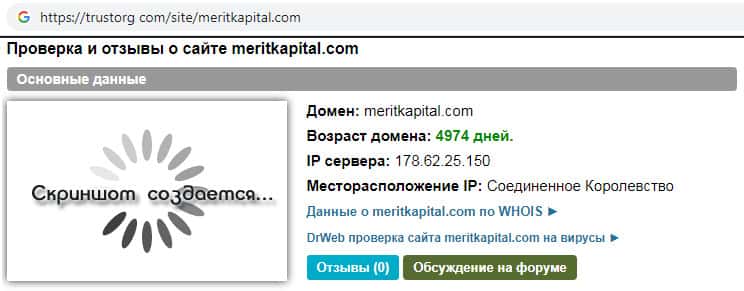 Проверка интернет-сервиса аферистов MeritKapital на trustorg com показала, что возраст домена к моменту написания статьи составляет 4974 дня, скорее всего домен купленный.