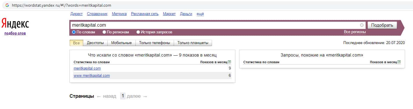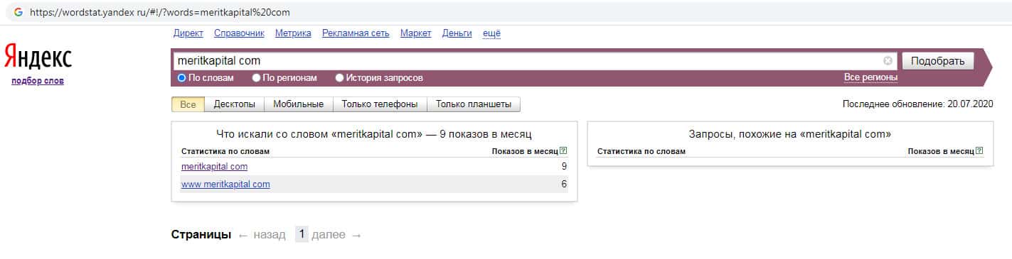 По брендовым запросам названия домена компании без точки "meritkapital com" в поисковике Яндекс показатель такой же, а именно 9 показов за месяц.