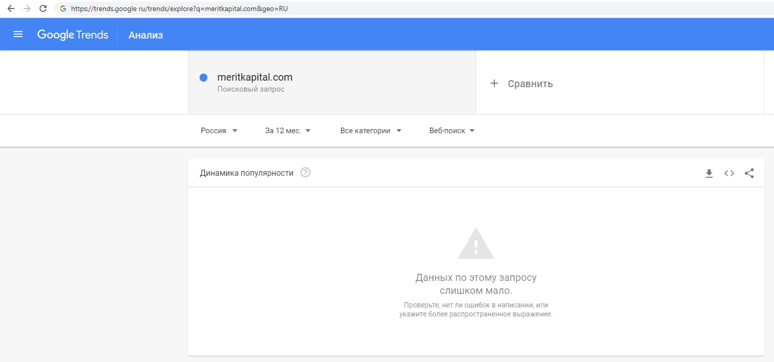 Информация о брендовых запросах русскоязычного названия компании без точки "Мерит Капитал" на trends google ru отсутствует.