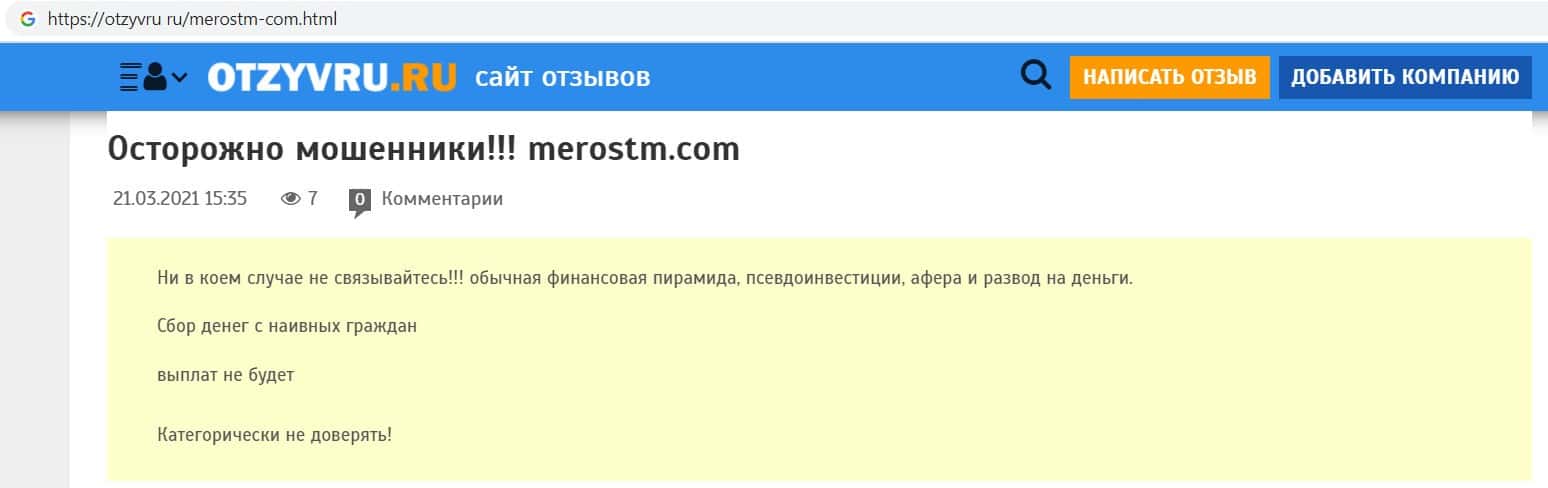 Своё мнение о конторе разводил Мерос ТМ высказал и сайт otzyvru ru, который указал, что компания собирает денежные средства своих клиентов, а так же не выводит деньги.