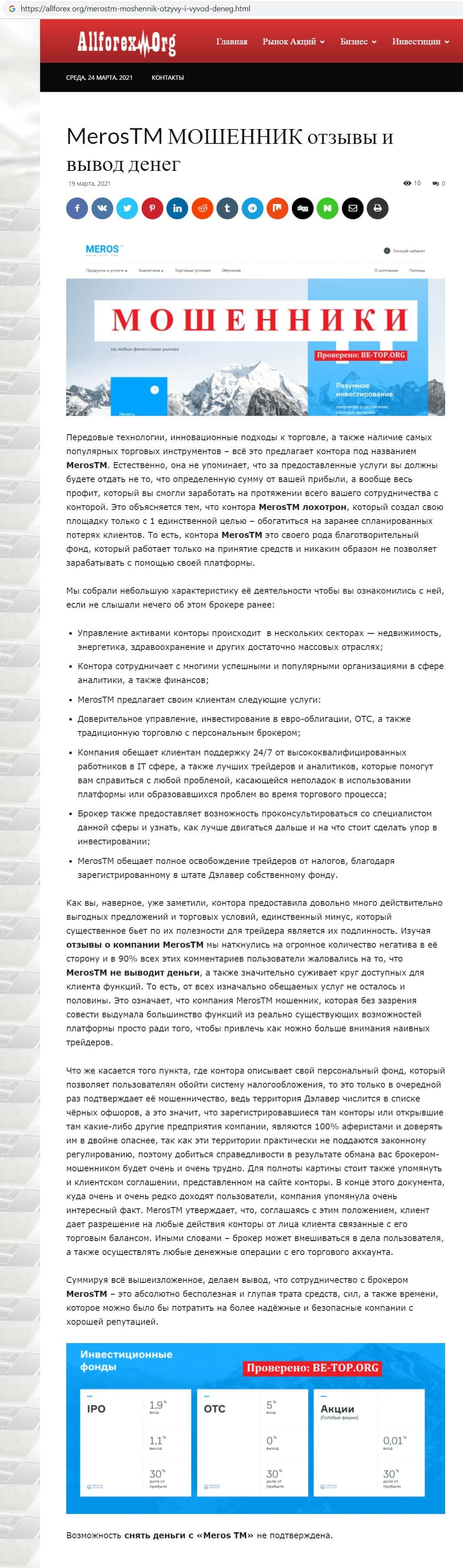 Ещё мы обнаружили статью о кидалах MerosTM на сайте allforex org, который так же указал, что фирма является мошенником, и с ним нельзя связываться, так как он не выводит средства.