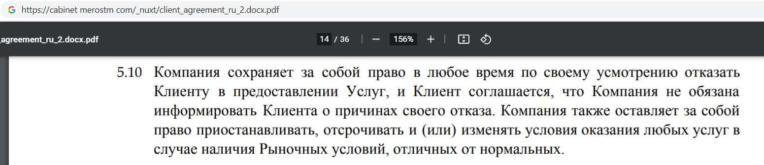 Фирма финансовых жуликов MerosTM так же указала, что в любое время и по собственному усмотрению может оказать клиенту в предоставлении услуг без объяснения причины.