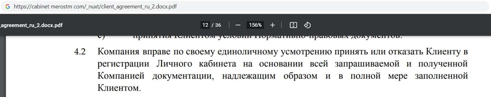 Мошенники MerosTM указали в своём клиентском соглашении пункт, согласно которому фирма имеет полное право по собственному усмотрению отказать клиенту в регистрации.