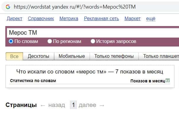 Так же мы проверили количество запросов компании жуликов MerosTM по русскоязычному названию фирмы, а именно "Мерос ТМ". Всего 7 раз пользователи выполнили этот запрос.
