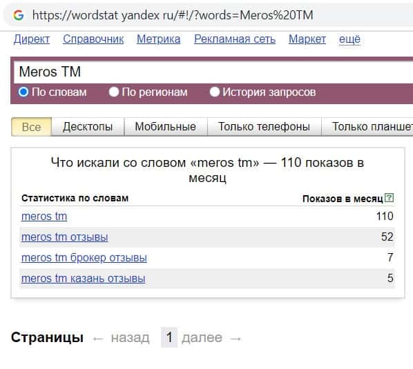 Далее мы проверили количество запросов компании аферистов MerosTM по названию конторы, но с пробелом, а именно "Meros TM". 110 раз пользователи совершили данный запрос.