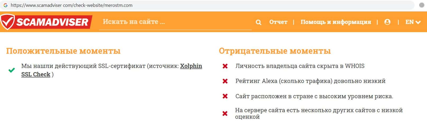 Мнение интернет ресурса scamadviser com о сайте лохотронщиков MerosTM