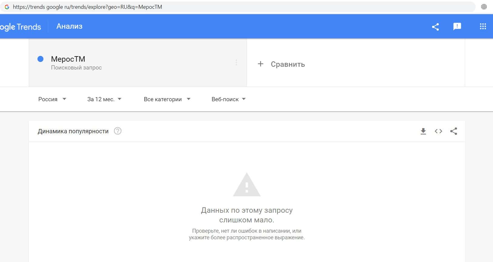 Мы решили проверить количество запросов компании разводил Мерос ТМ в Google по названию фирмы, а именно "MerosTM". Данный запрос пользователи не выполняли целый год.