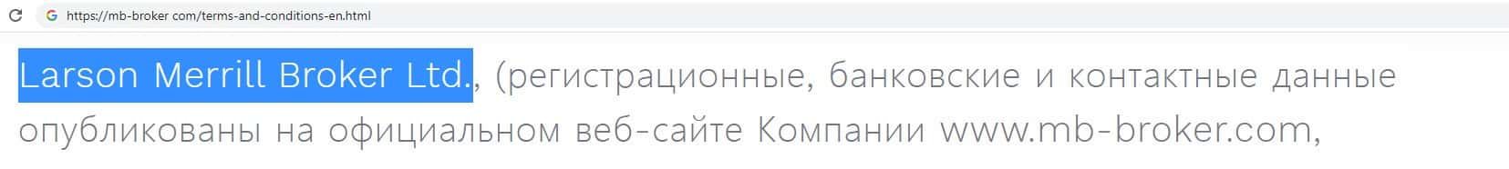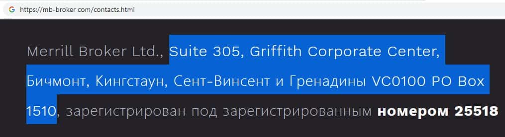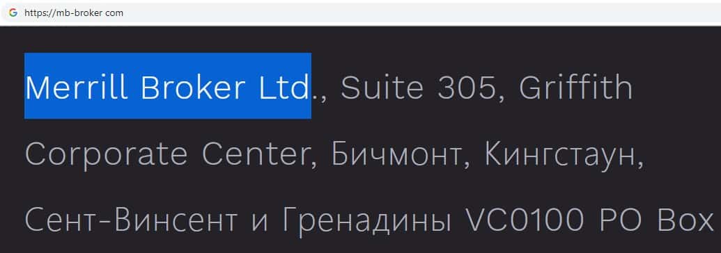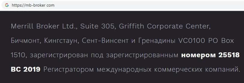 На сайте MB Broker указано юридическое лицо Merrill Broker Ltd, которое владеет мошенническим онлайн-сервисом mb-broker com, оффшорной скам-компании MB Broker.