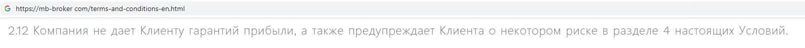 Шулера MB Broker предупреждают о том, что торговля на их сайте сопряжена высоким уровнем риска потери средств, за что компания конечно же ответственности не несет.