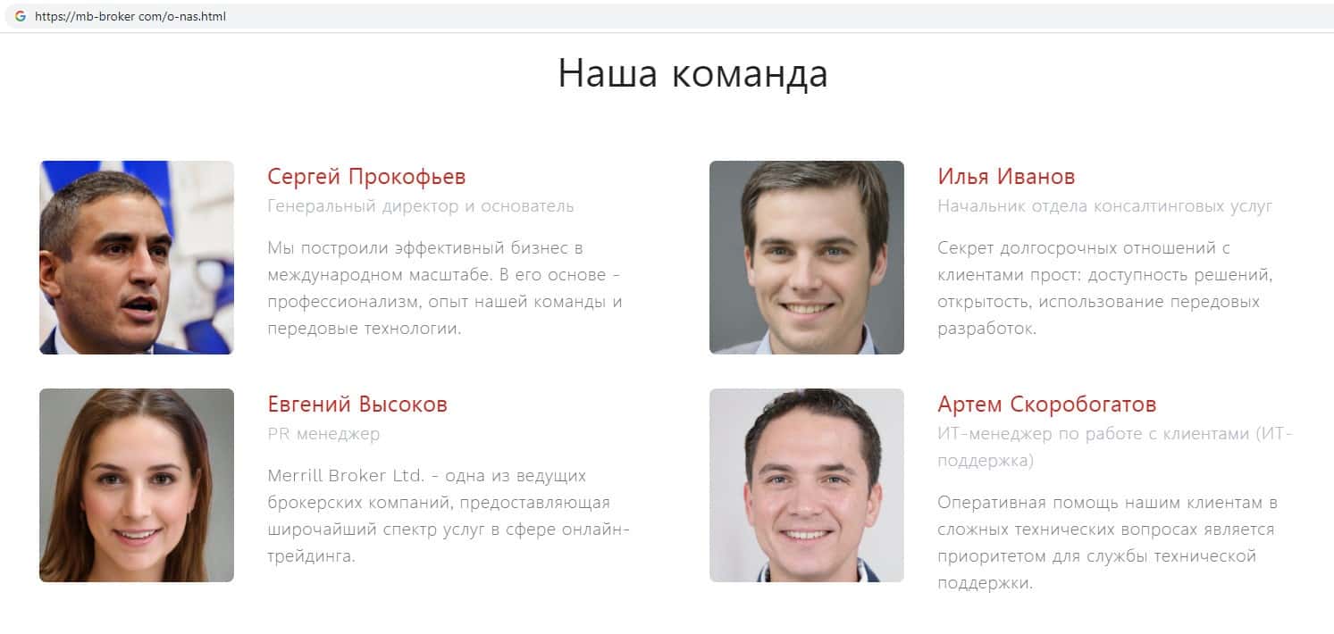 Аферисты Меррилл Брокер на своем дырявом сайте разместили вымышленную информацию о руководстве компании, где есть явные ошибки в характеристике якобы сотрудников.